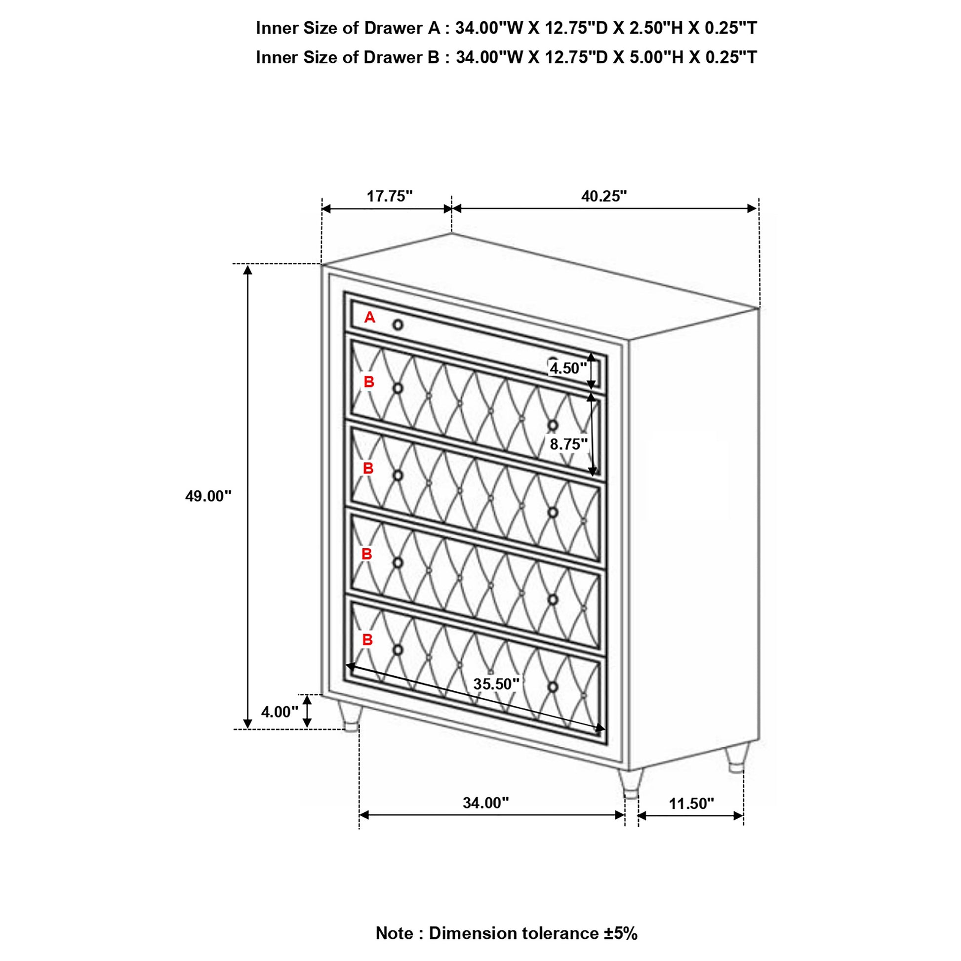 • Los frentes de los cajones con botones capitoné incluyen botones de cristal sintético para un efecto glamoroso.