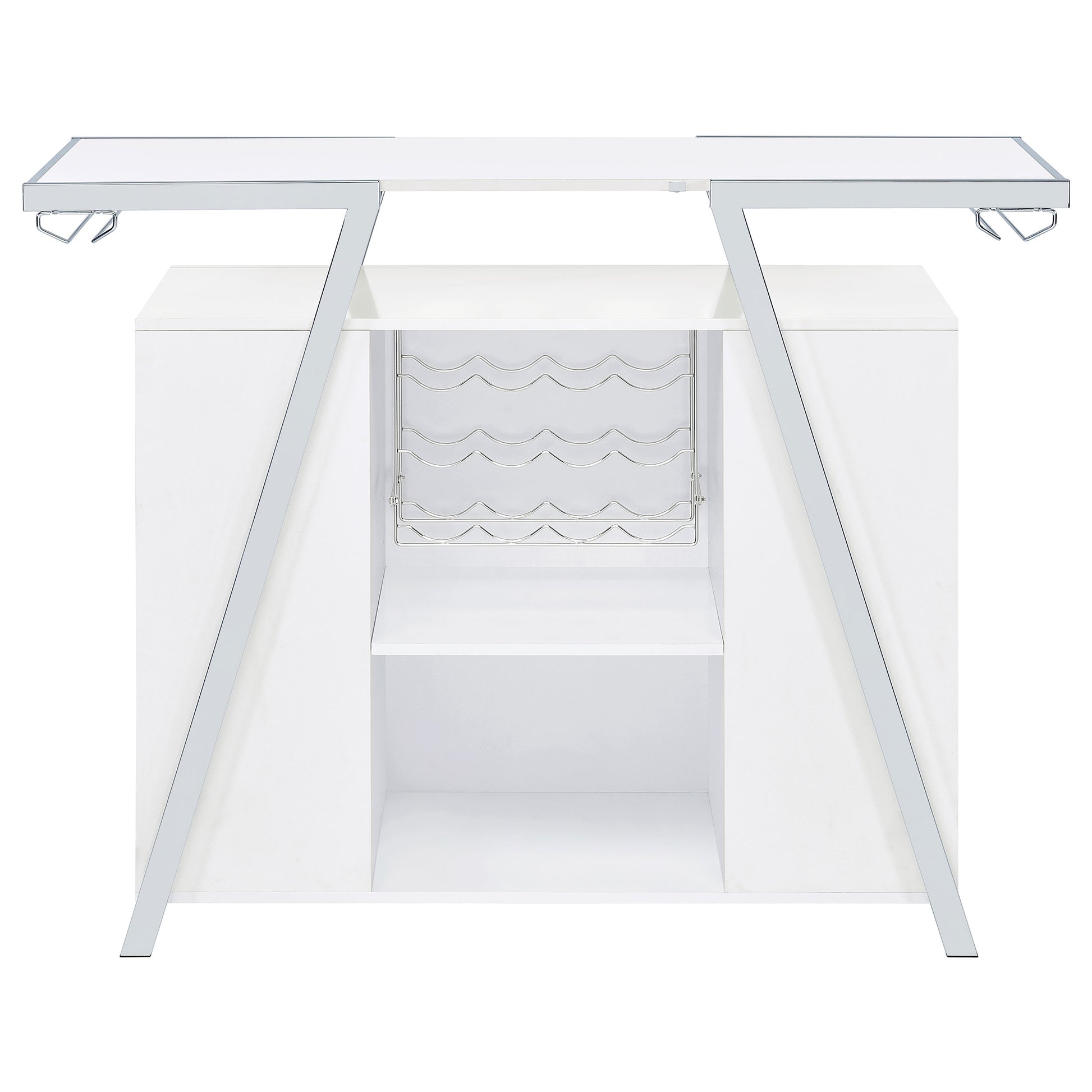 • Barra para el hogar contemporánea e inspirada en módulos, construida con MDF, revestimiento de papel y chapa con acabado blanco brillante y estructura de metal con motivo geométrico.