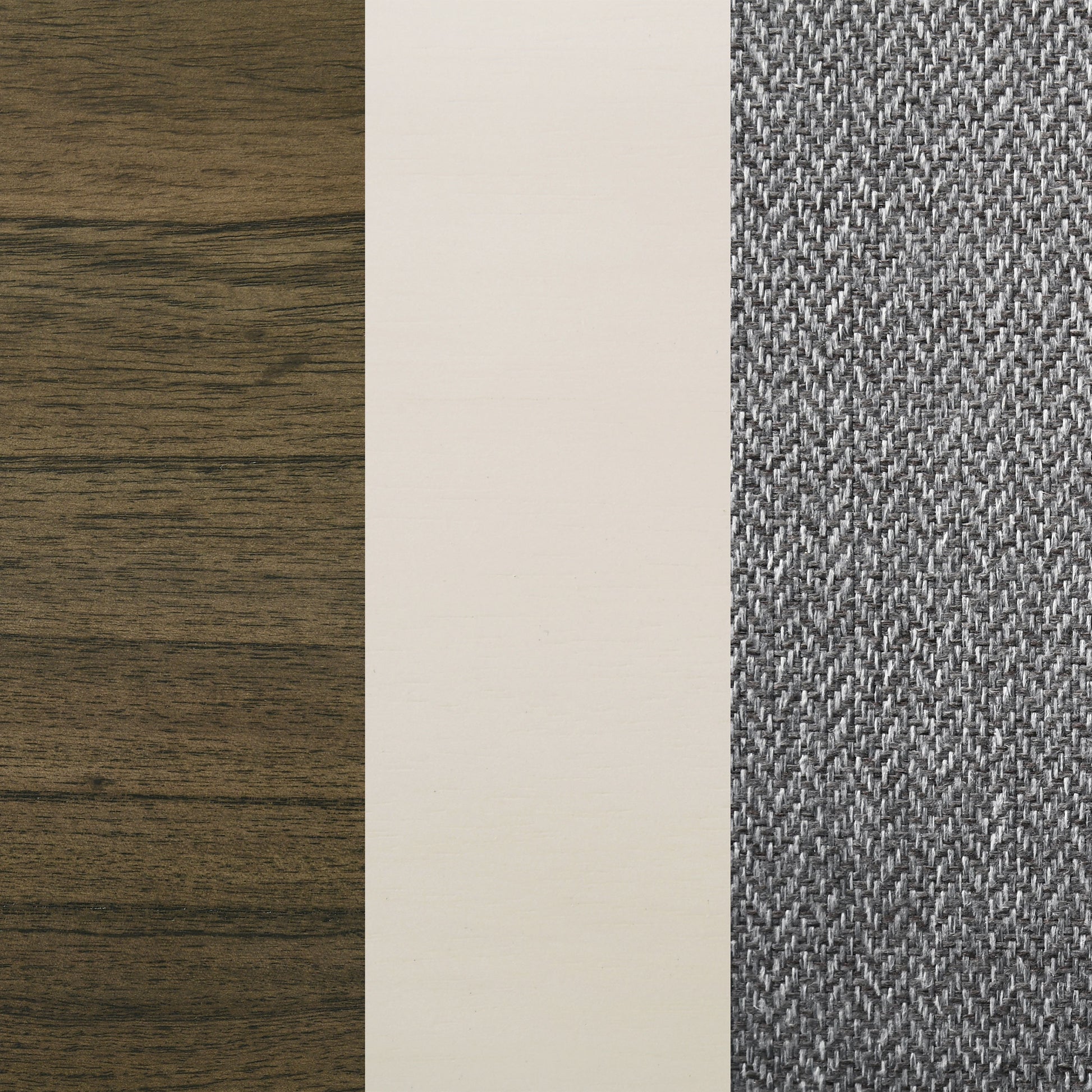 • Las sillas laterales están construidas con bases de asiento en X y cuentan con tapizado gris suave sobre cojines.
