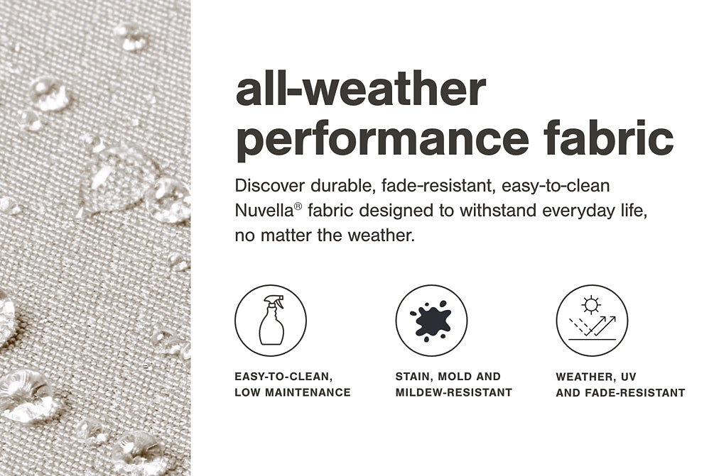 | Detalles | Incluye 8 piezas modulares: 6 sillas de exterior y 2 mesas auxiliares de exterior, Estructura de silla y mesa de aluminio, Tela teñida en solución de alto rendimiento, Nuvella® es una tela para exteriores que se puede limpiar y ofrece resistencia a los rayos UV, Herrajes de acero inoxidable, Diseñado para soportar los elementos duros del exterior, Asiento acolchado, Cojín de respaldo incluido, Incluye funda protectora de PVC para la intemperie, Limpie la tela con agua y jabón suave, deje secar al aire; para manchas difíciles, use una solución de 1 taza de blanqueador en 1 galón de agua, Requiere ensamblaje | |