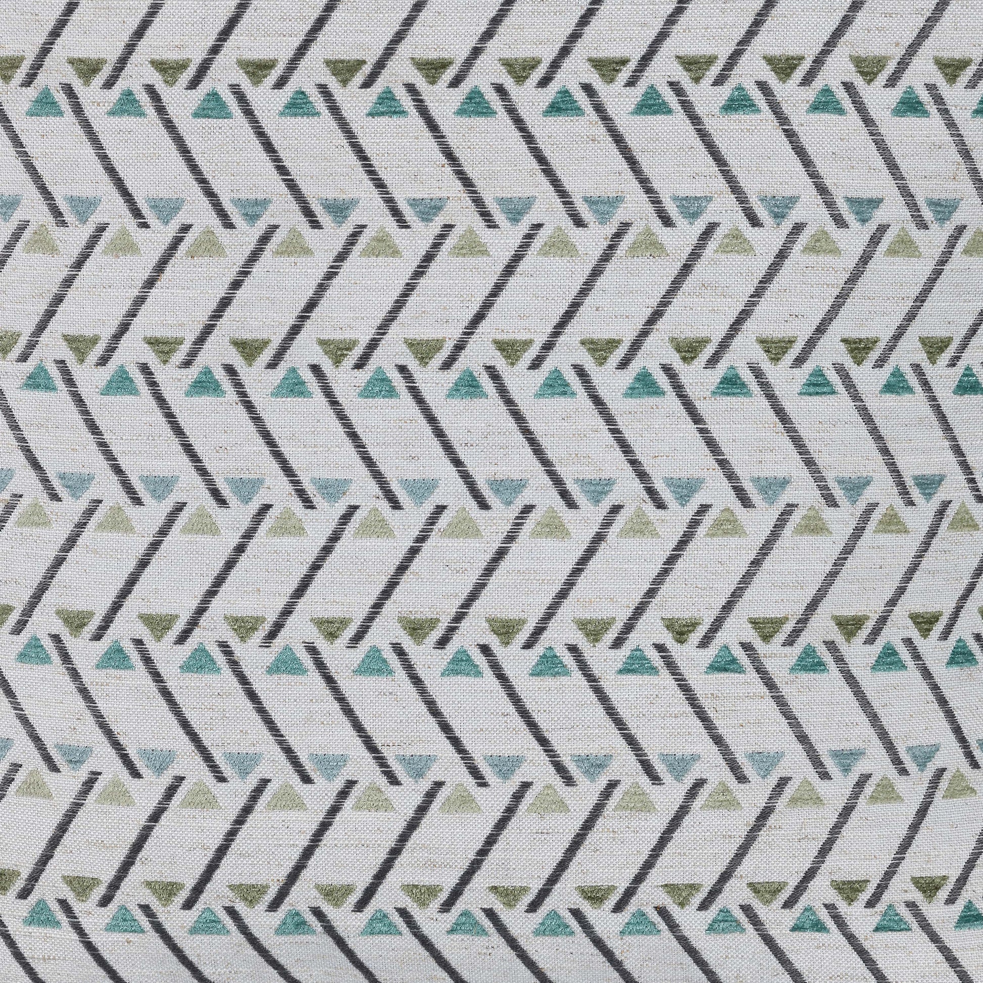• La tapicería de tela presenta un patrón geométrico multicolor en una paleta basada en grises.