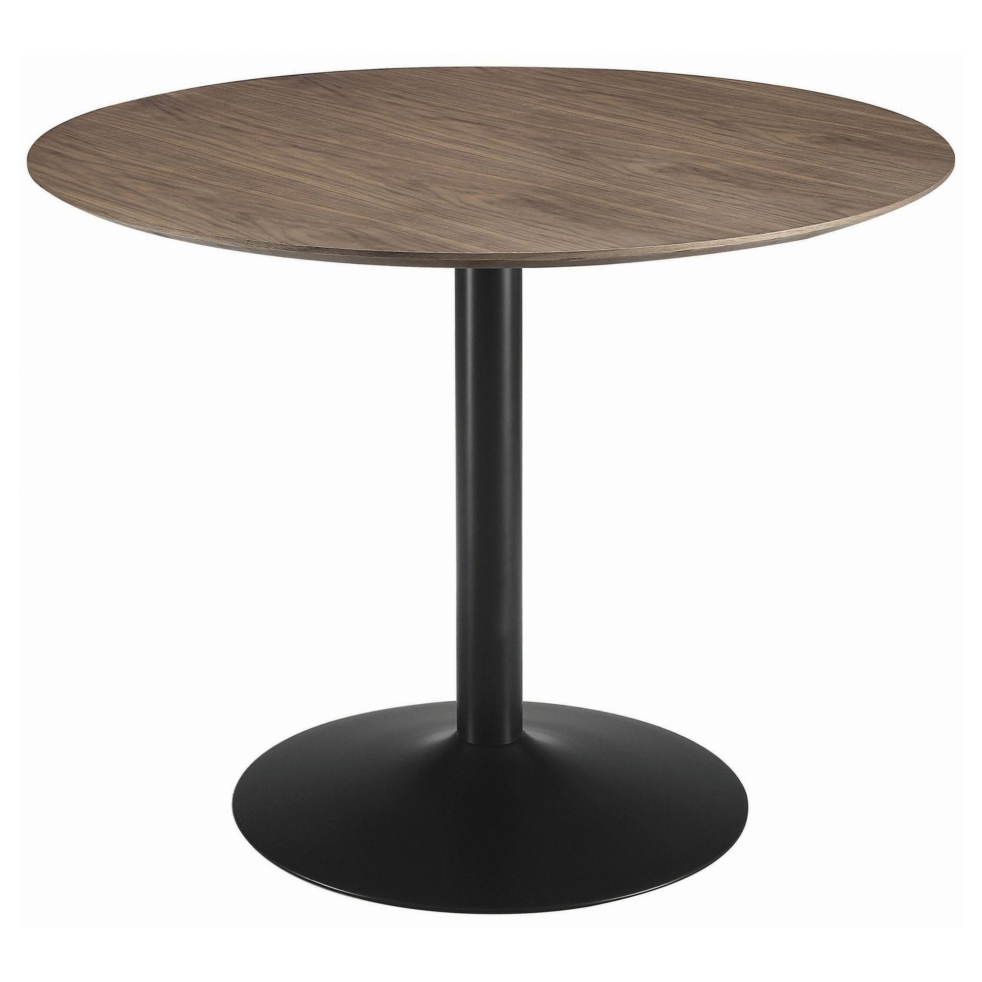 • Mesa de comedor redonda con tapa lisa de chapa de nogal en un acabado marrón intenso