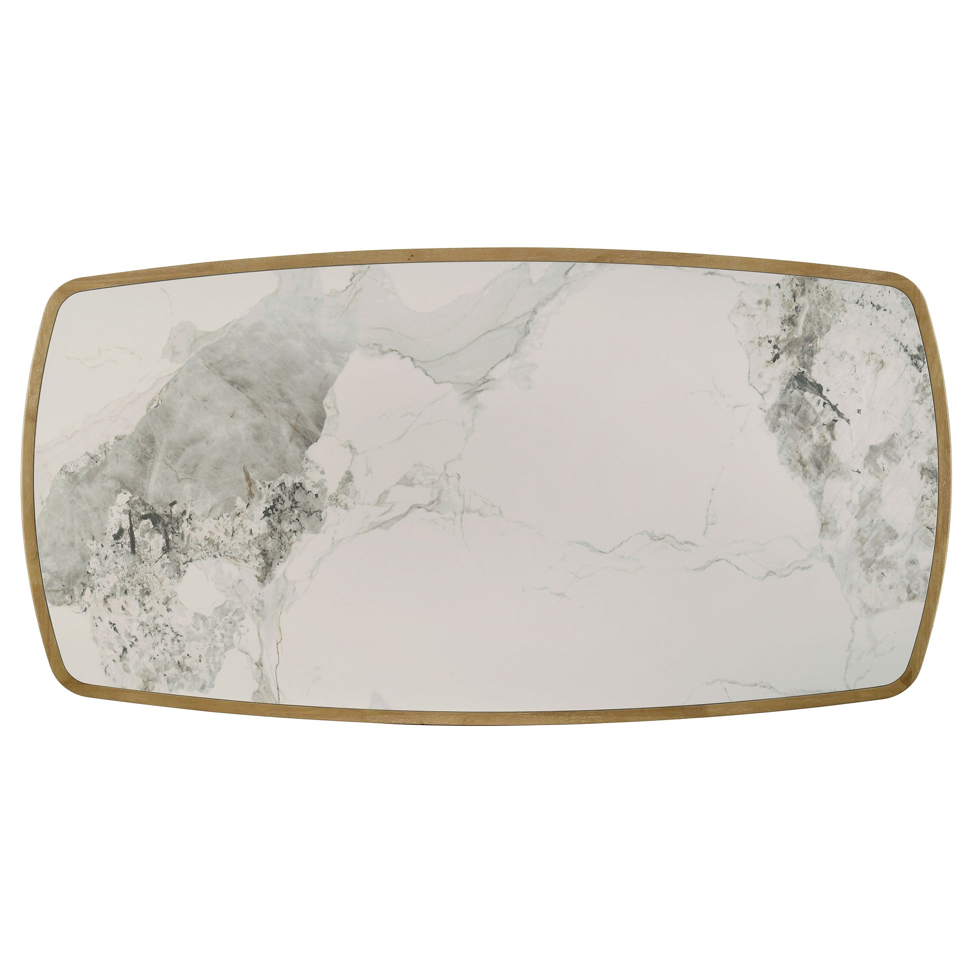 • Top is framed in solid wood with curved edges that soften the tabletop profile