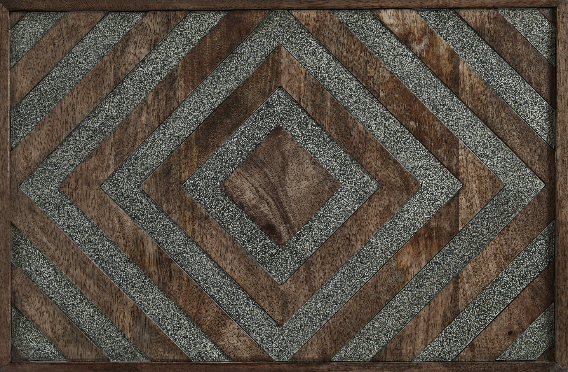 | Detalles | Fabricado con madera de mango y madera de ingeniería, acabado cálido en nogal, los lados tienen un patrón de diamantes acentuado con un elemento textural con incrustaciones de oro grisáceo. | |