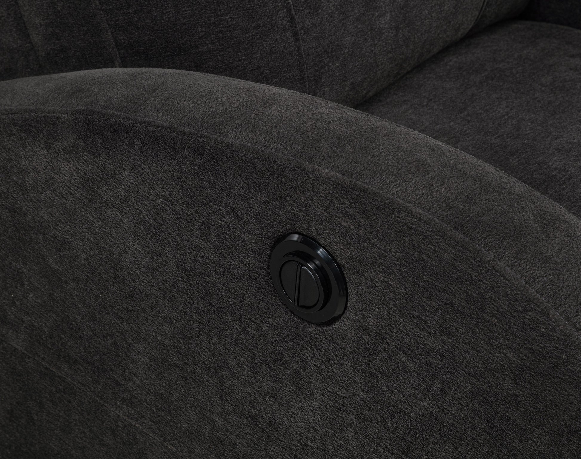 • Power recliner in charcoal grey fabric blends classic shape with compact modern proportions