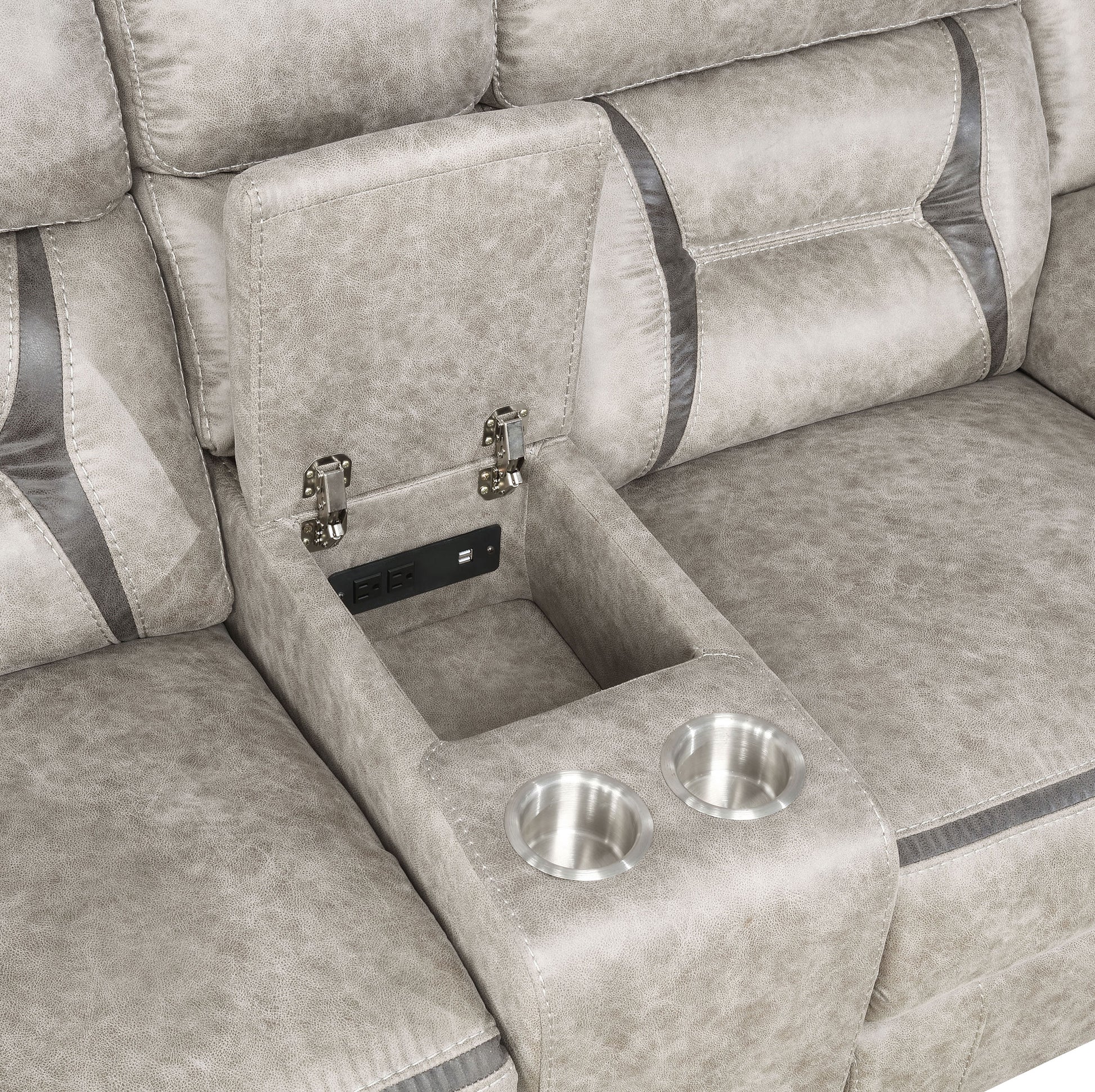 • El sofá de dos plazas cuenta con un mecanismo de deslizamiento suave, consola con almacenamiento en la parte superior elevable, toma de corriente (2 CA/2 USB) y dos portavasos de acero inoxidable.