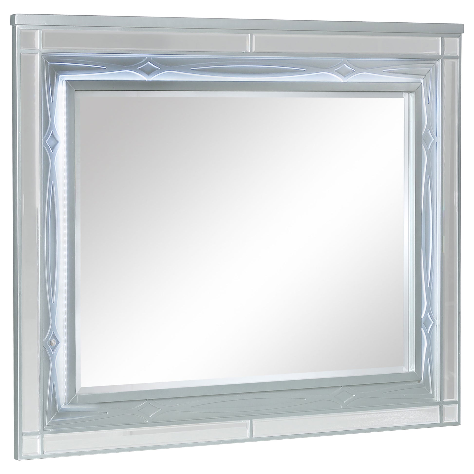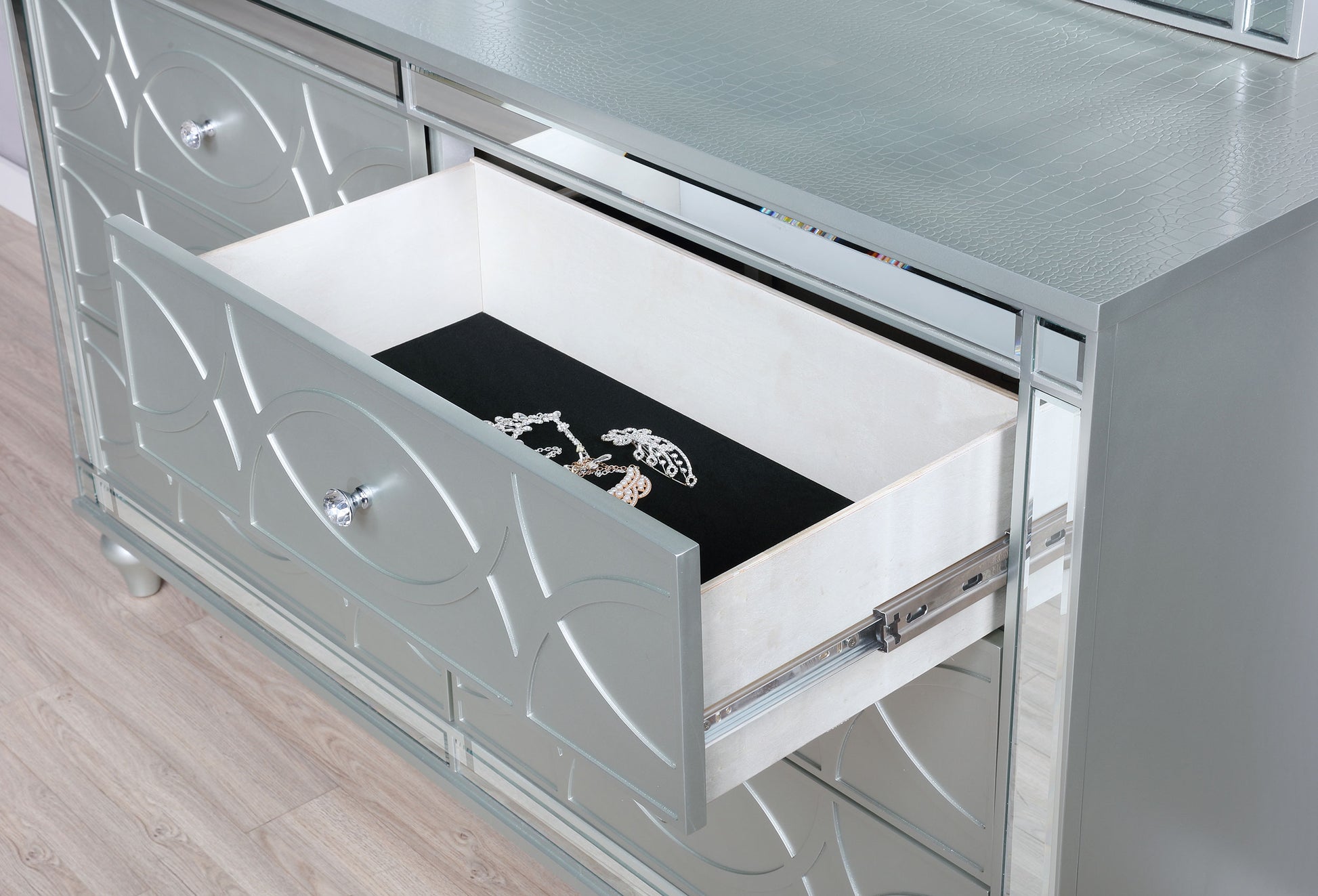 • El acabado metálico plateado combina con detalles espejados y herrajes de cristal en todas partes.