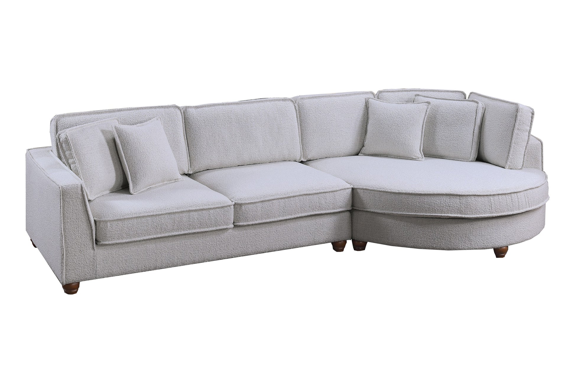 This 2-piece sectional set brings visual interest and comfort to the heart of your home with its rounded chaise and clean-lined design. Measuring an impressive width, this set combines a Right Arm Facing (RAF) Chaise and a Left Arm Facing (LAF) Sofa to create an open, inviting layout ideal for stretching out or gathering with company. The RAF Chaise section features a softly rounded shape that adds flow and character to the overall silhouette. This subtle curve brings a gentle, sculptural element that breaks away from the boxy lines of traditional sectionals. The LAF Sofa, complements the chaise seamlessly, creating a balanced yet visually dynamic design. Wrapped in textured bouclé fabric, the upholstery adds depth and tactile richness. The surface catches natural light beautifully, creating soft highlights that enhance the fabric’s texture and tonal variation. Bouclé is known for its nubby, woven feel—a fabric that invites touch and adds an elevated aesthetic without overpowering the room. This sectional rests on low-profile gourd-shaped legs, each standing 3 inches tall. These sculpted bases add a touch of modern design flair while subtly lifting the silhouette just above the floor, allowing the form of the sectional to speak for itself. Their rounded shape mirrors the gentle curve of the chaise, reinforcing the soft, organic elements of the piece. Adding refinement and detail, piped outer stitching outlines the frame, emphasizing the sectional’s clean lines and craftsmanship.