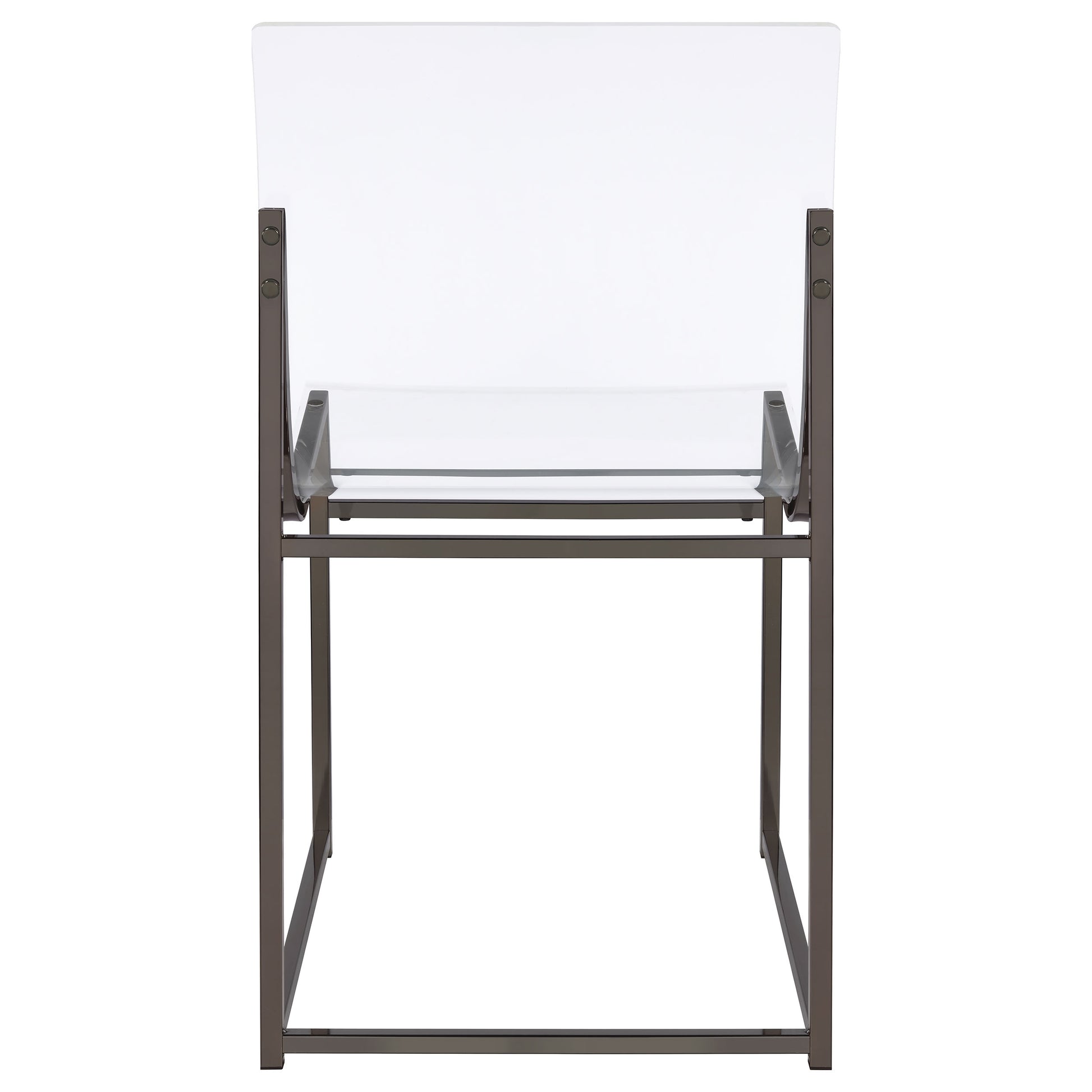 • Las sillas de comedor cuentan con respaldos de acrílico transparente y marcos de metal minimalistas.