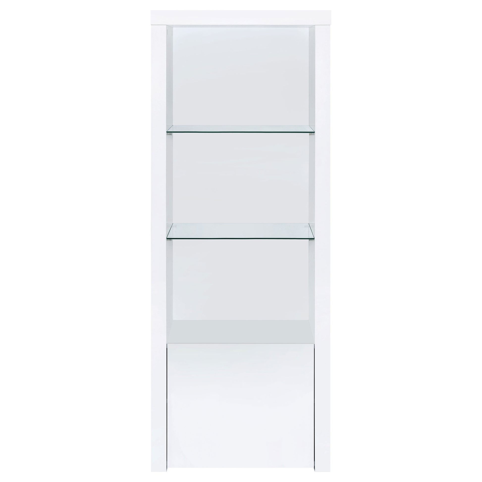 • La torre contemporánea agrega un gabinete inferior y estantes de exhibición de vidrio.
