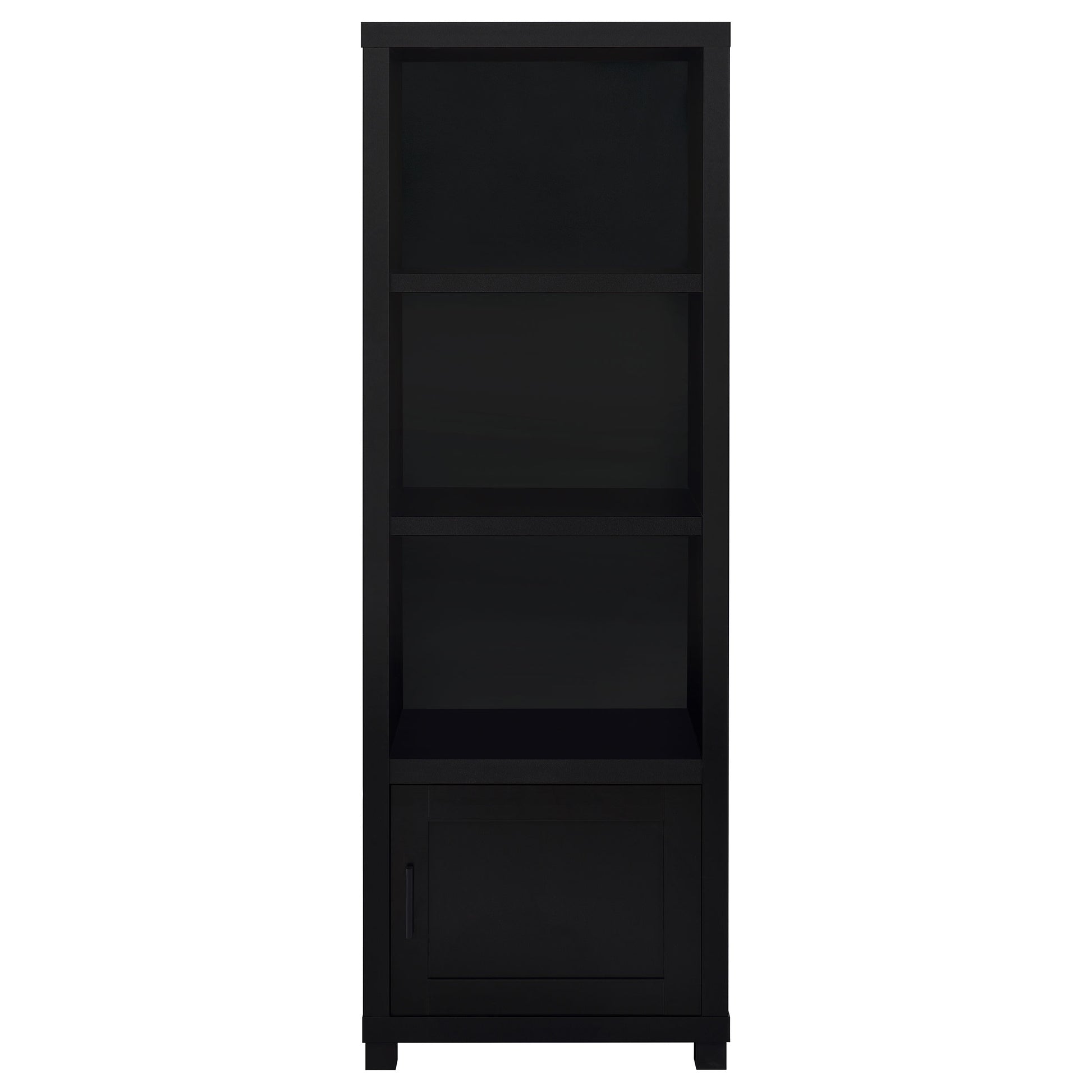 • Torre multimedia con tres niveles de estanterías abiertas para libros, medios y artículos de exhibición.