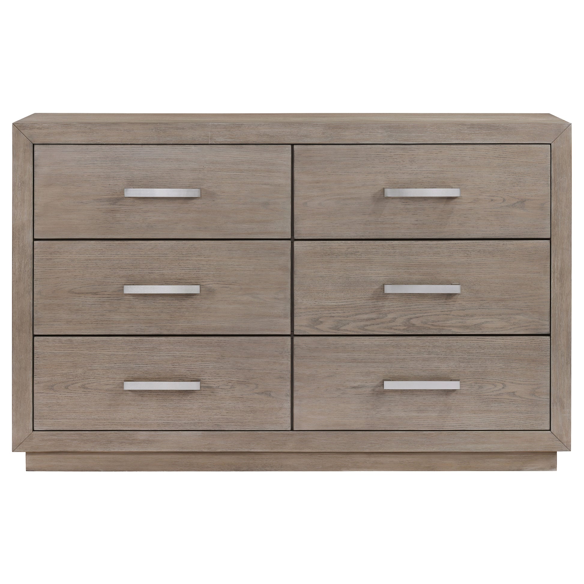 • Aumente su dormitorio con el almacenamiento fácil y elegante que ofrece esta moderna cómoda de seis cajones.