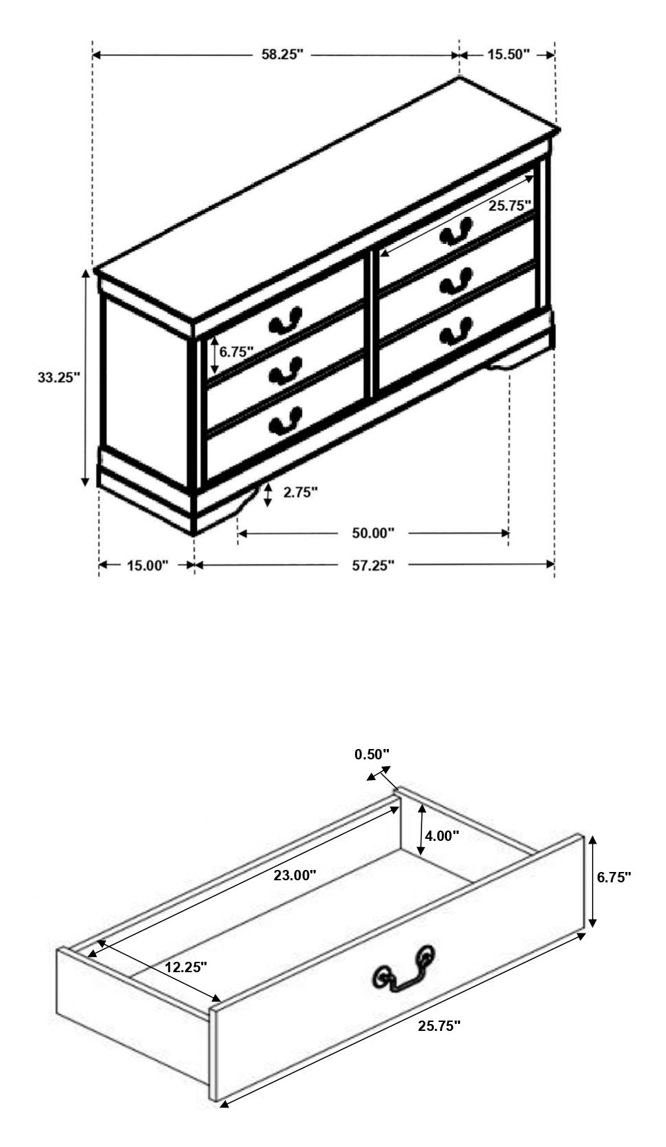 • Las manijas de los cajones con acabado en níquel decoran los frentes de los cajones.