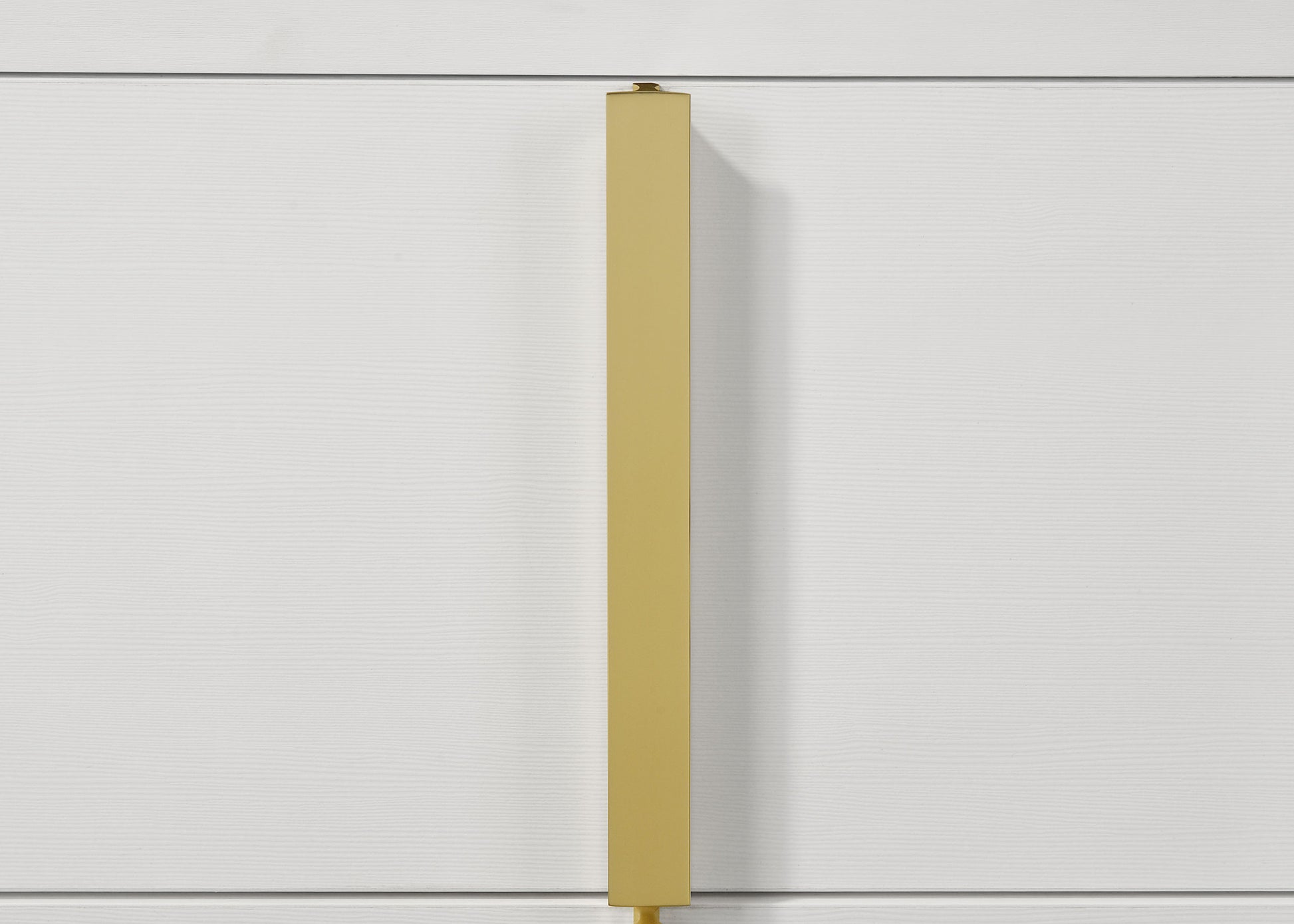 • Amplios cajones con tiradores verticales dorados y tocador rematado con un espejo enmarcado.