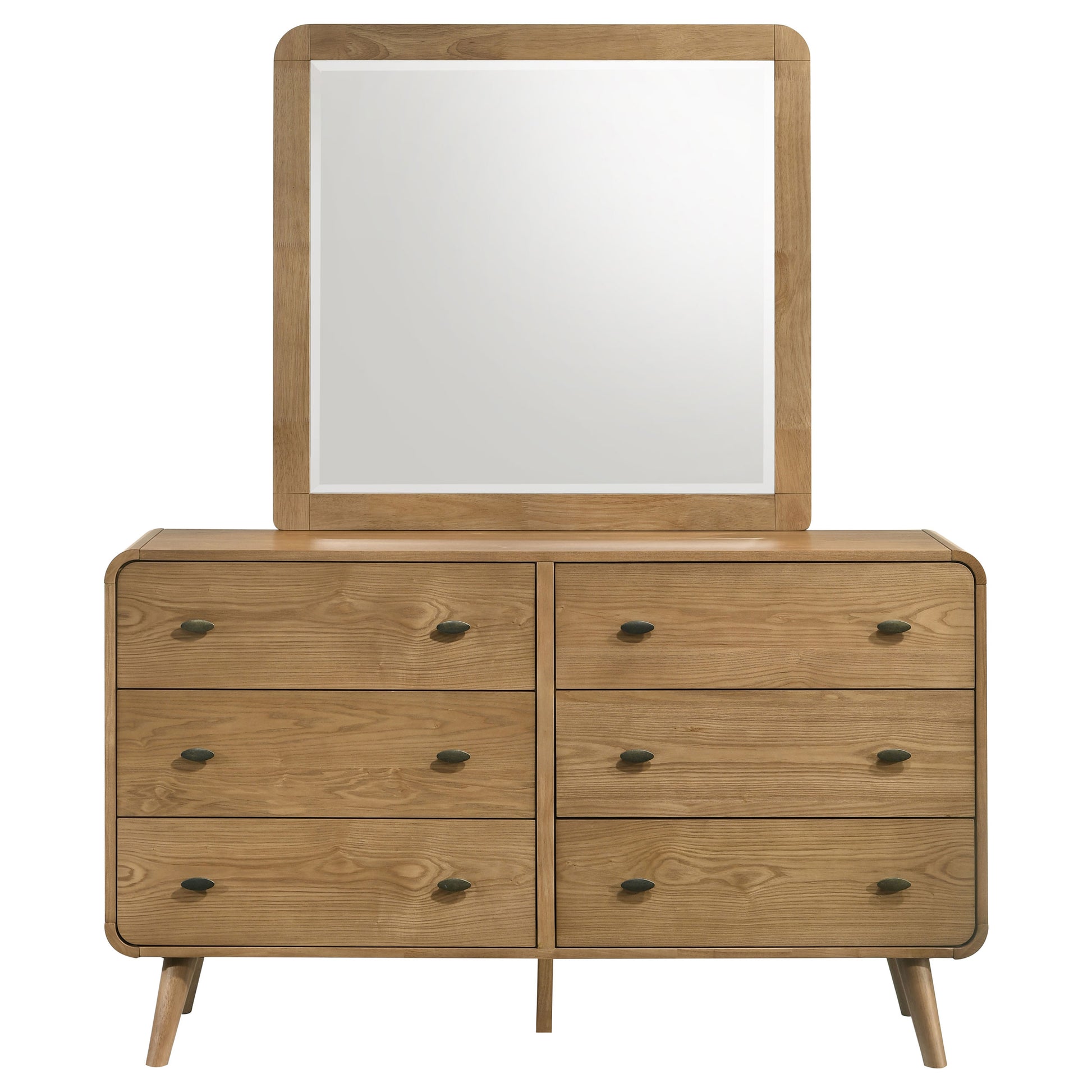 • Conjunto de tocador y espejo de fresno claro con una estética cohesiva