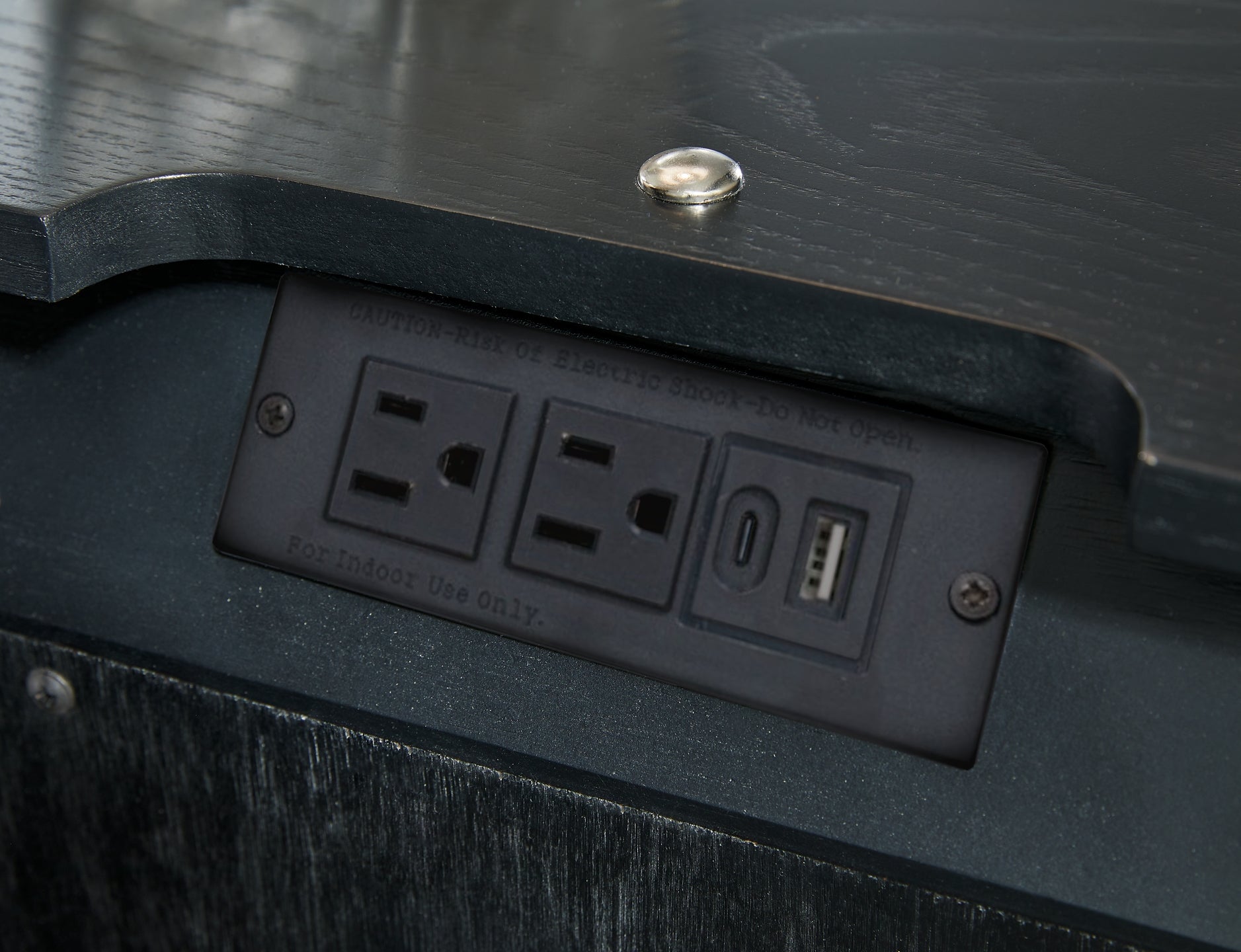 | Detalles | Fabricado con madera maciza y chapa de fresno, acabado negro sobre superficie de veta de madera texturizada, tiradores en tono níquel cepillado, bordes en cascada, cajón de deslizamiento suave con interior completamente terminado, construcción de cola de milano y deslizadores laterales resistentes con cojinetes de bolas, estante inferior tipo cubículo con luz nocturna LED incorporada, fuente de alimentación de 110 V con puertos de carga USB-A y USB-C, cable de alimentación incluido; listado por UL | |