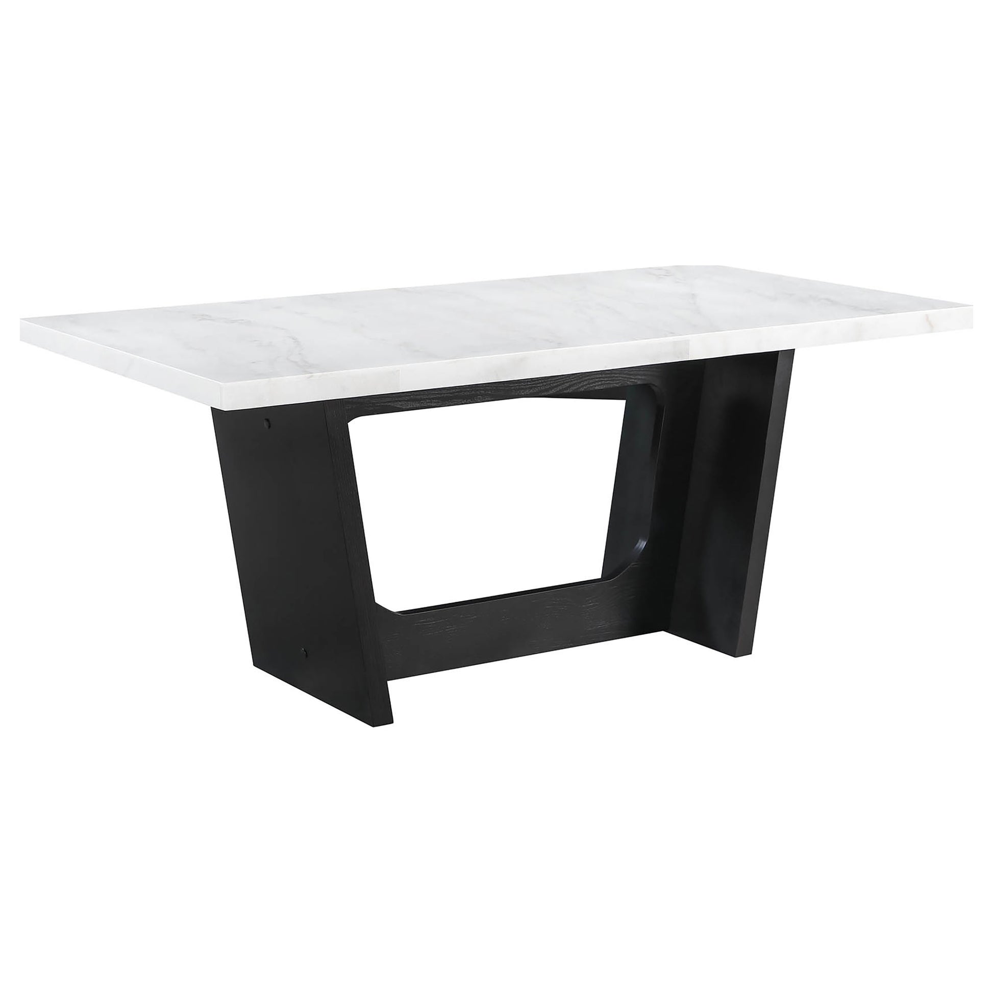 • La mesa está sostenida por una base de panel de chapa de roble con un tablero de mármol.