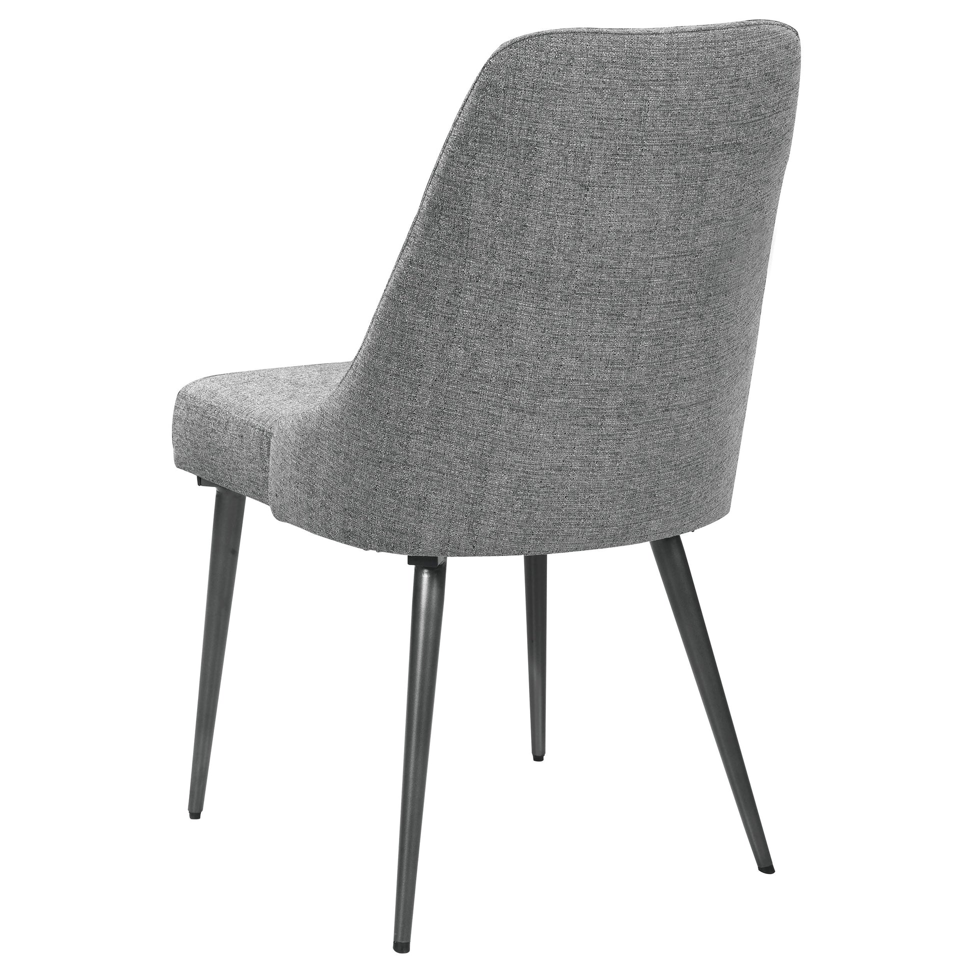 • Las sillas cuentan con tapizado de tela texturizada gris y patas cónicas de color bronce.