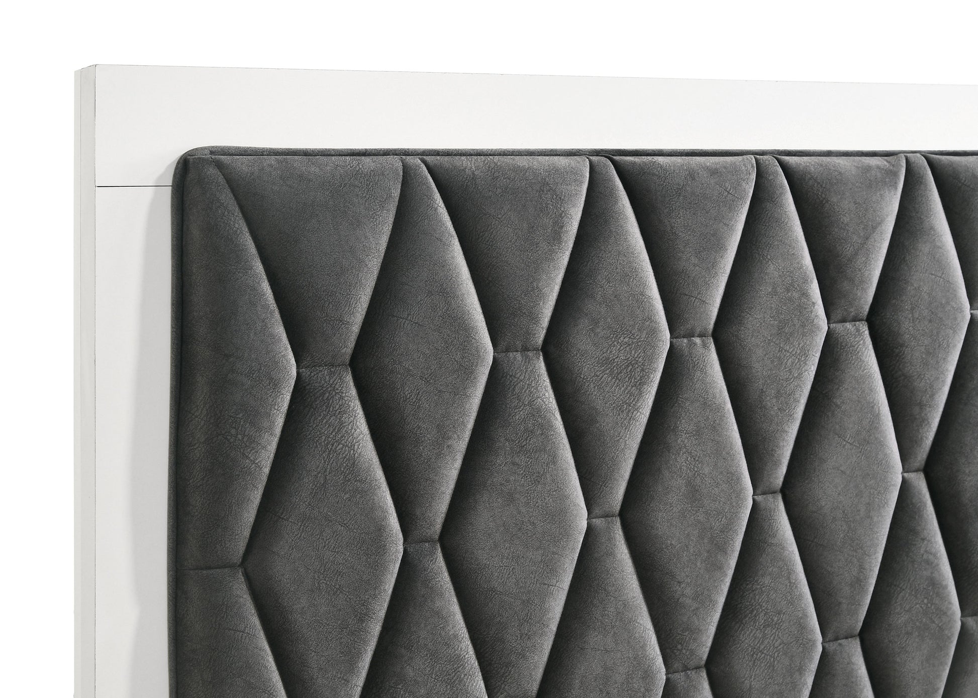 • El capitoné hexagonal alargado crea una apariencia audaz en una cabecera acolchada con tela gris oscuro.