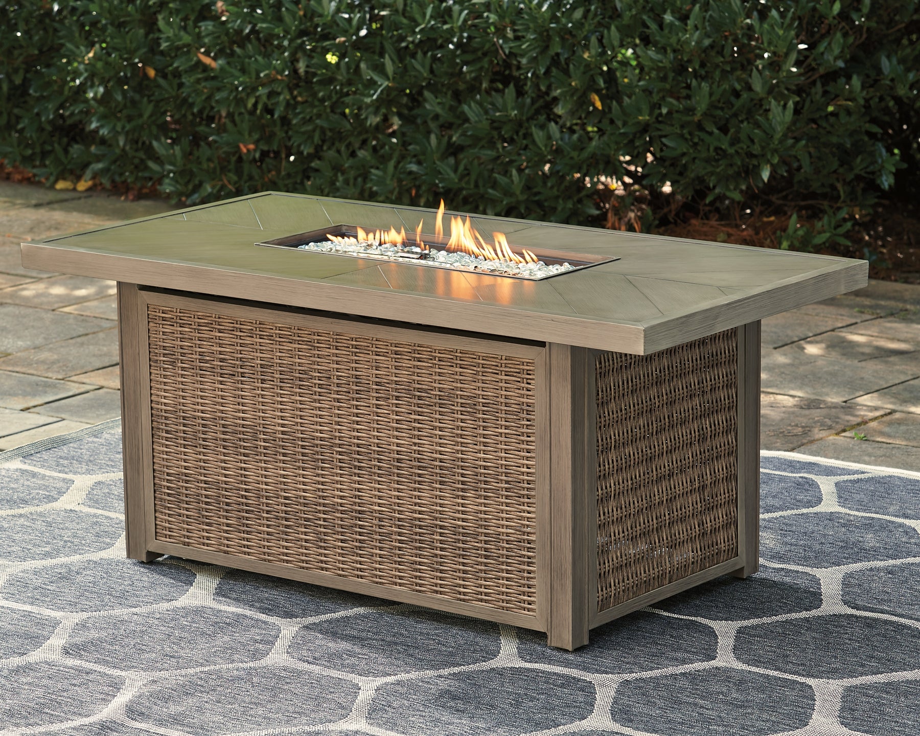 | Details | Gas fire pit table with CSA-approved 30,000 BTU stainless steel burner, glass beads, burner cover and all-weather protective cover, Aluminum top, All-weather resin wicker handwoven over powder coated rust-proof aluminum frame, Battery-operated ignition system with adjustable flame control; battery included, Cabinet door conceals gas propane tank (not included) and 2 shelves, Gas line or propane tank connector hose not provided, Convertible to natural gas, Assembly required | |