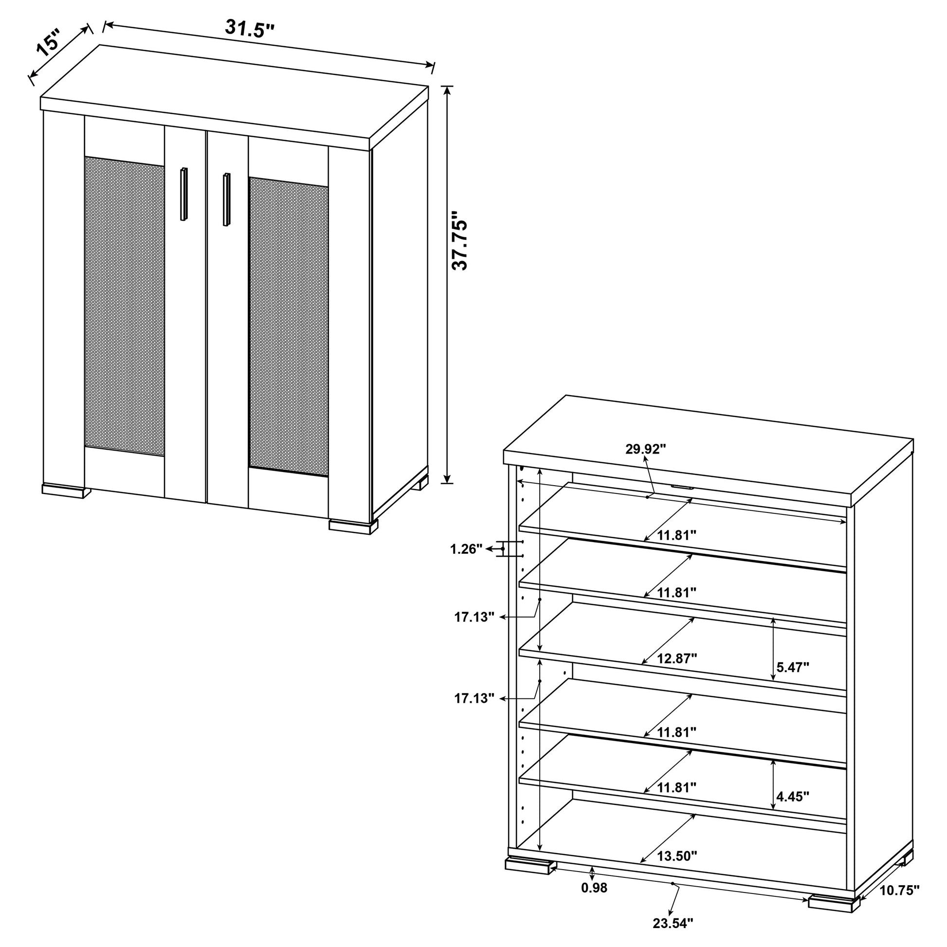 • Shoe cabinet offers closed storage with seven interior shelves for organized footwear