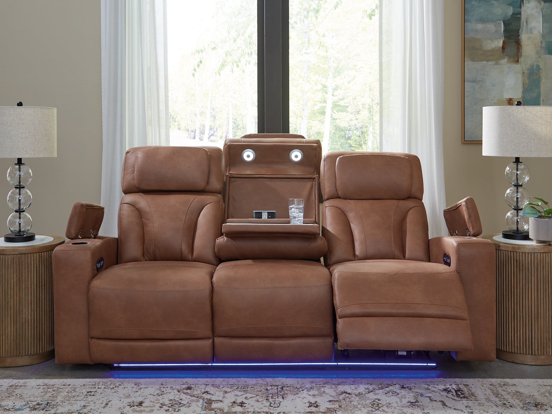 | Details | One-touch power control with adjustable positions, Easy View™ adjustable headrest and zero-draw USB port, Zero-draw technology only consumes power when the USB receptacle is in use, Corner-blocked frame with metal reinforced seat, Attached cushions, High-quality foam cushions wrapped in poly fiber, Faux leather upholstery, Storage armrests with 2 cup holders, 2-stage cup holder converts to a flat surface for coffee mugs, Ambient blue LED lighting on cup holders, base and storage cutouts for a theater-style experience, Drop-down table with LED reading lights, dual cup holders, electrical outlet, USB charging (USB-A and USB-C) and wireless charging, Power cord included; UL Listed | |