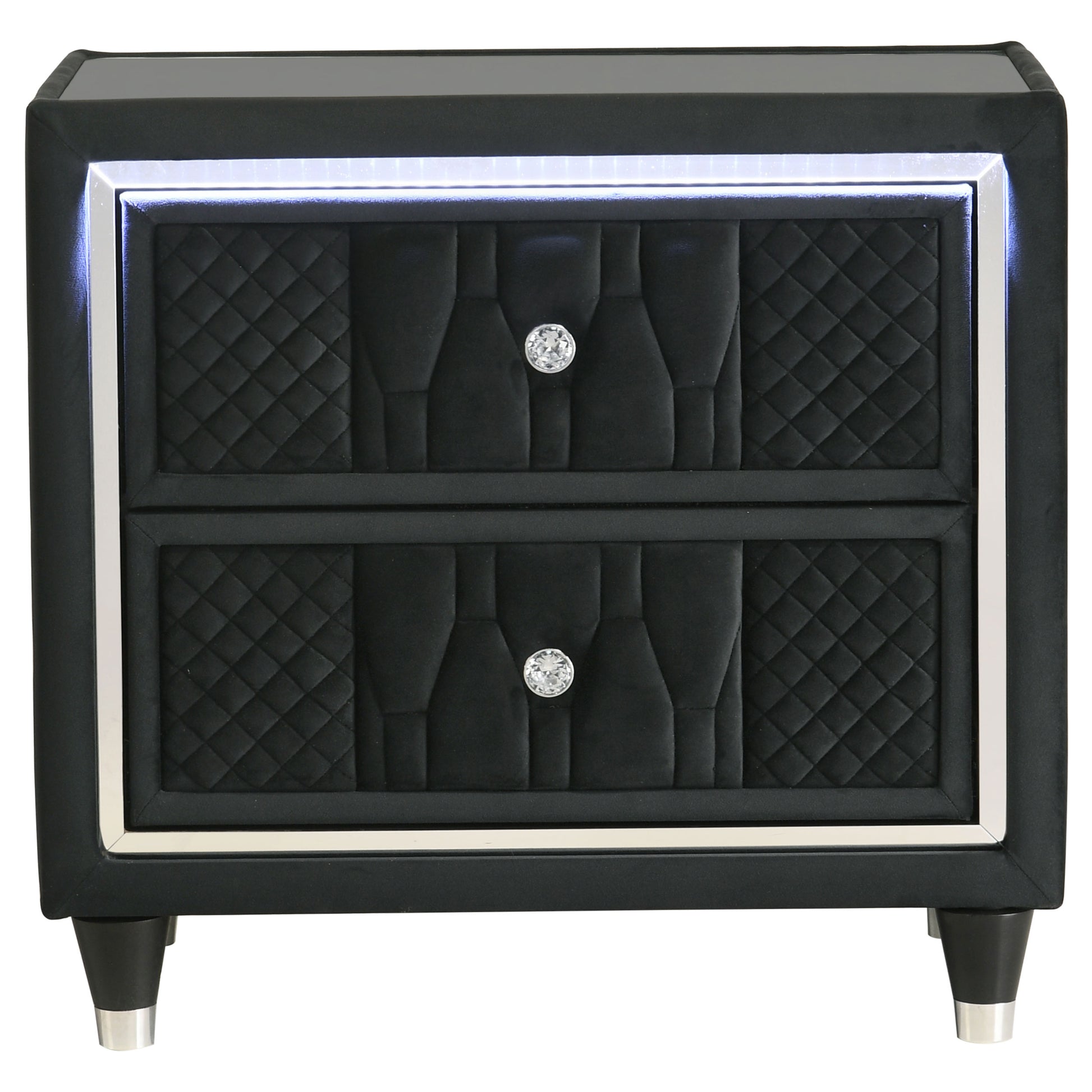 • Two-drawer nightstand fully upholstered in a black velvet for luxe layering