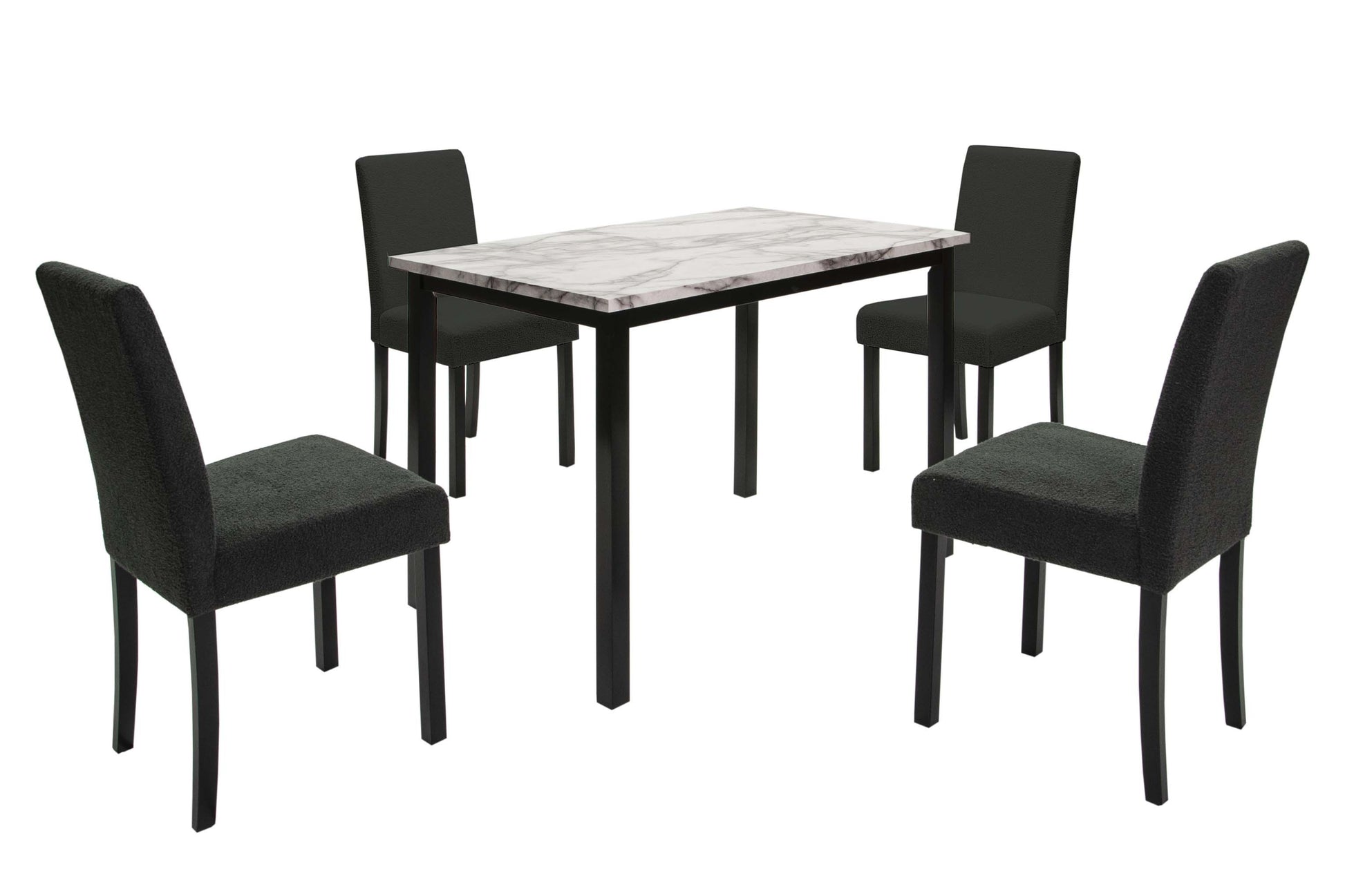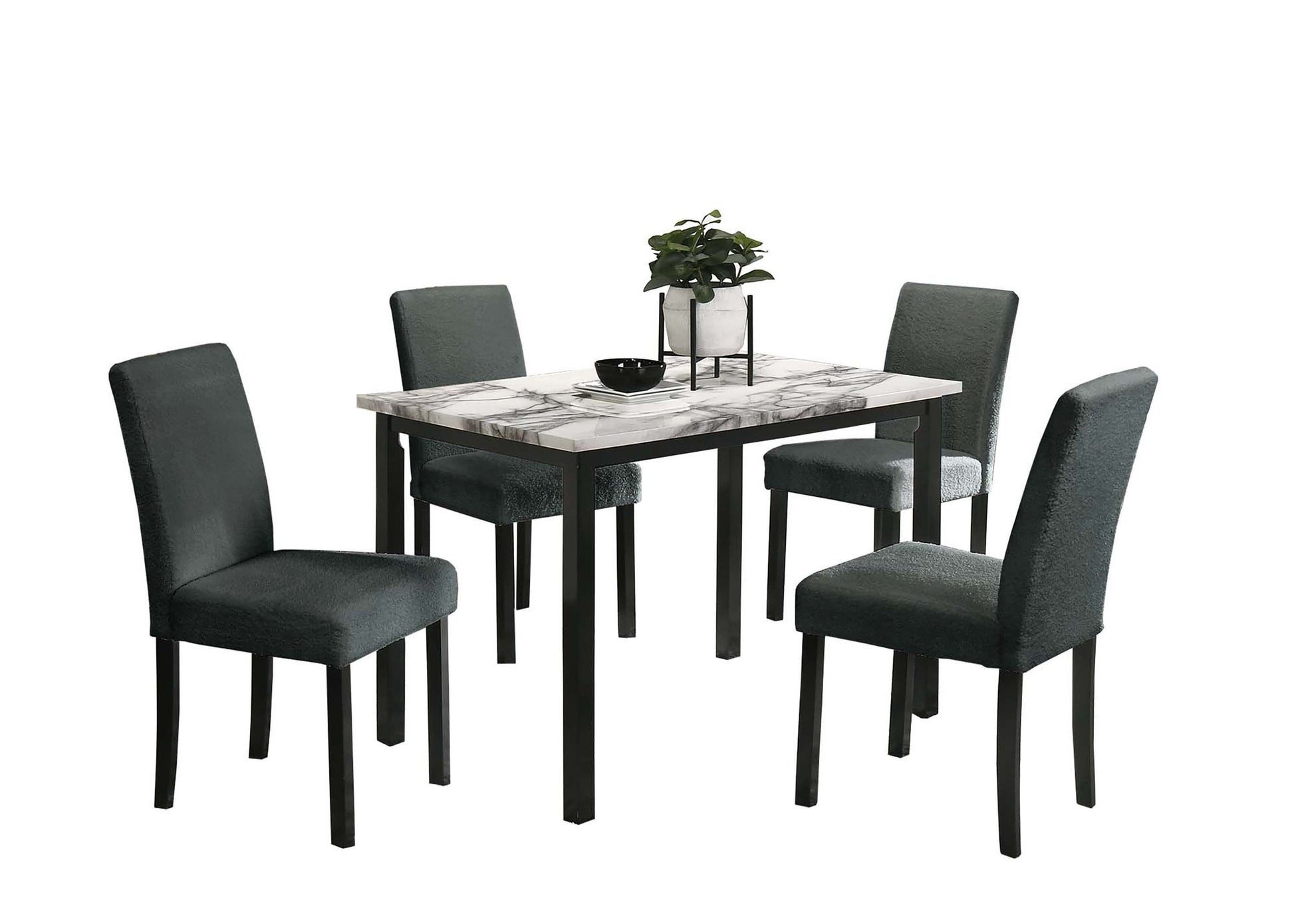 This stunning 5-piece dining set is perfect for gathering family and friends around for memorable meals. The table features sleek square legs, adding a touch of modern flair to your home. Its dual-toned design and faux leather marble top exude elegance and sophistication, making every dining experience feel luxurious. Crafted with comfort in mind, the chairs are fully upholstered with soft wool fabric upholstery. Sink into relaxation as you enjoy long conversations and delicious meals with loved ones. The set includes a table, and four chairs.