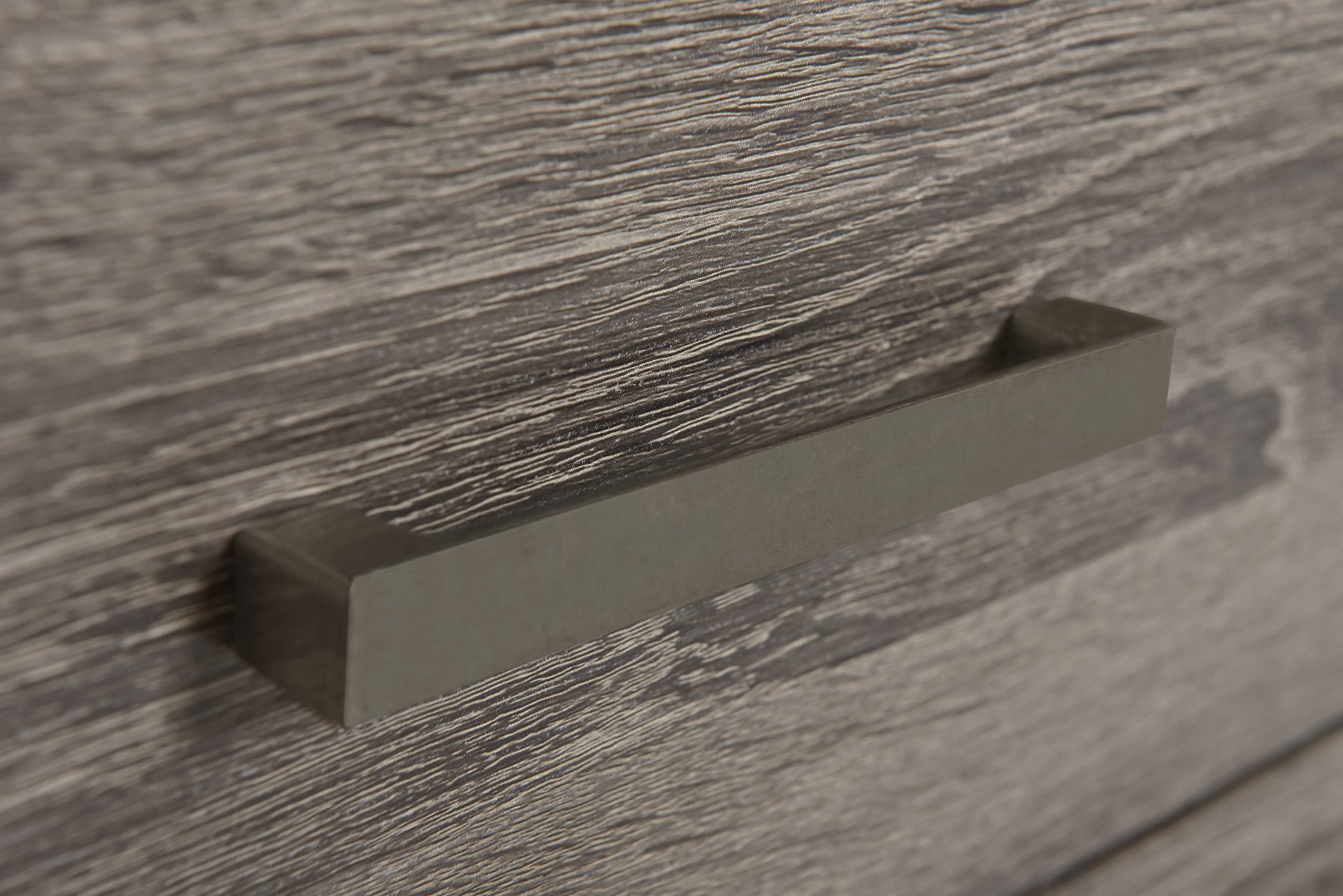 • A brown oak wood grain finish is complemented with metal bar handles that add a touch of contrast