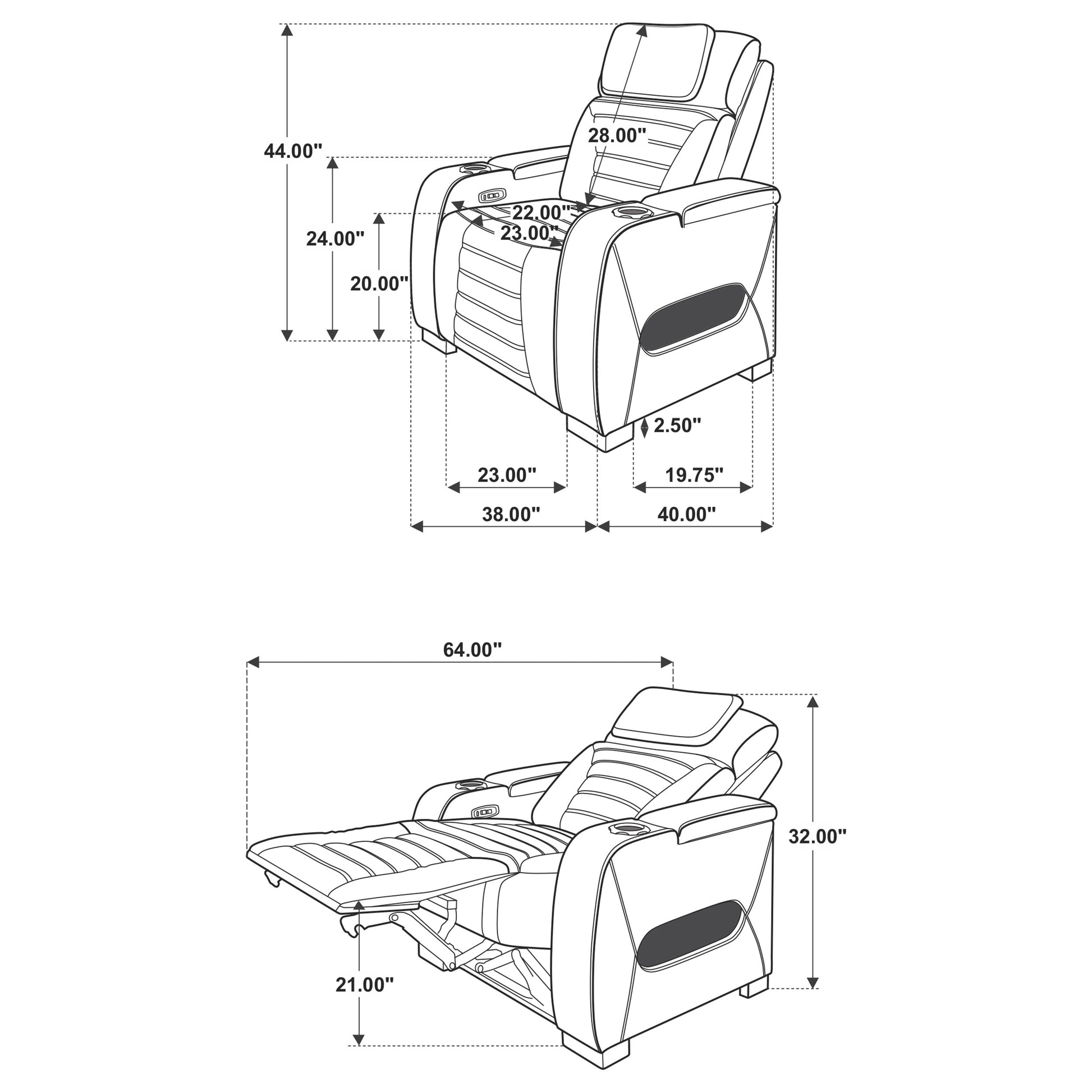 • Sleek armrests include built-in cup holders for movie night or everyday relaxation